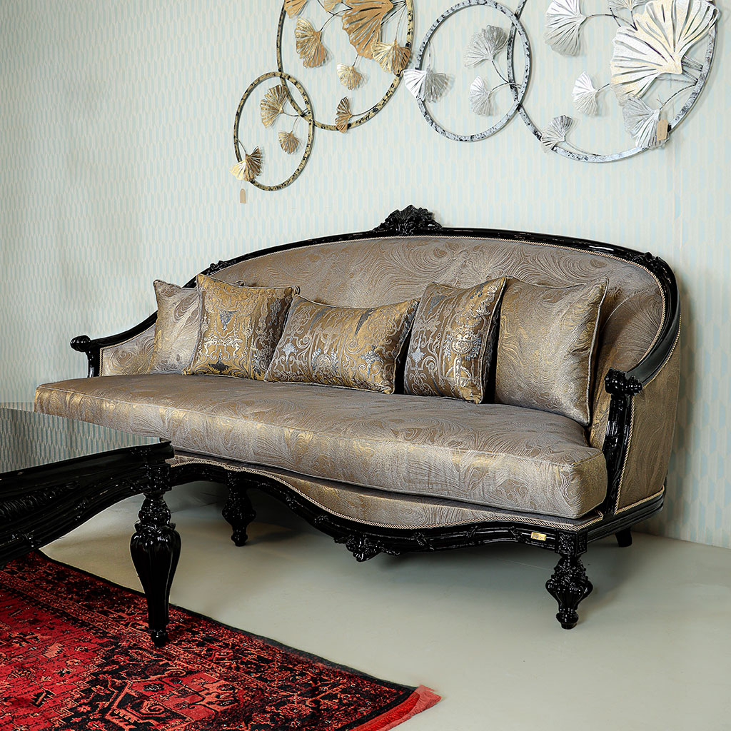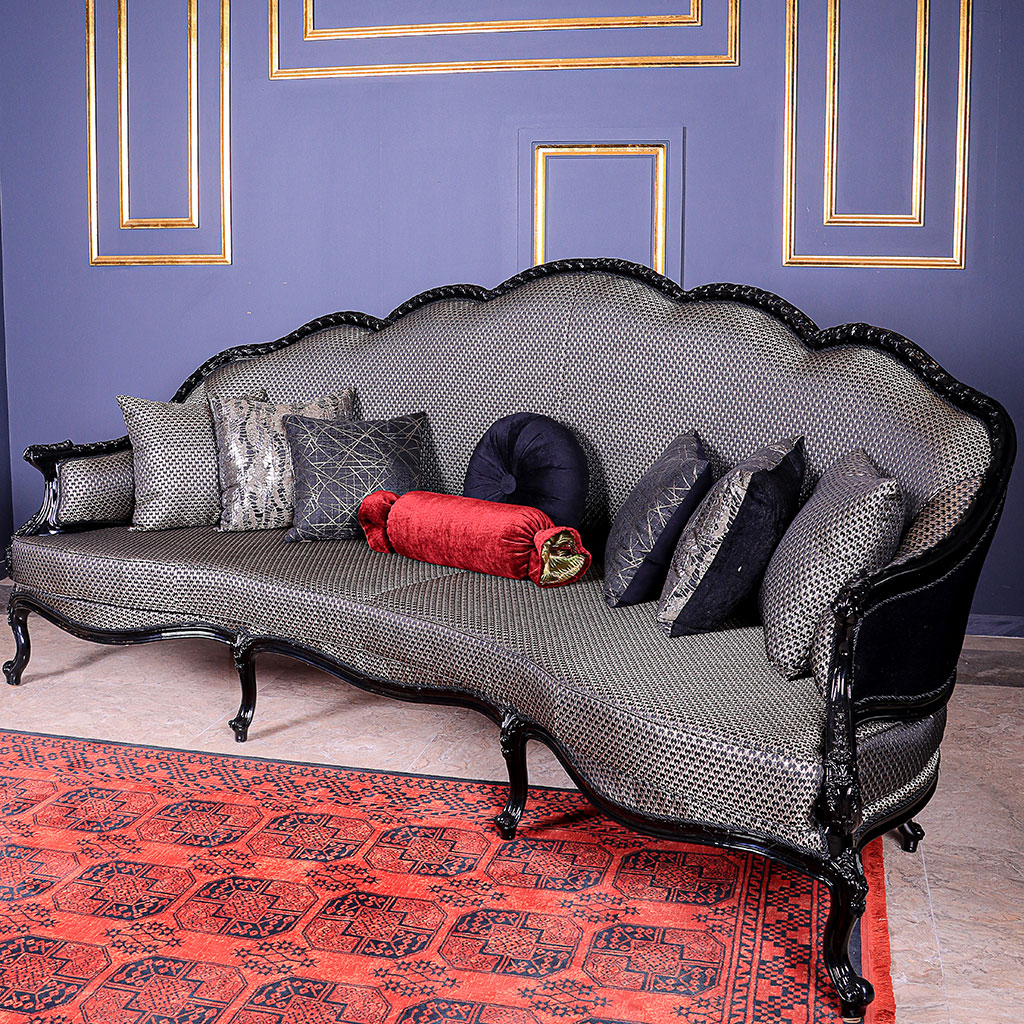 - رنگها: طلایی و نقرهای براق، چوب تیره، پارچههای مخملی با الگوی بزرگ.